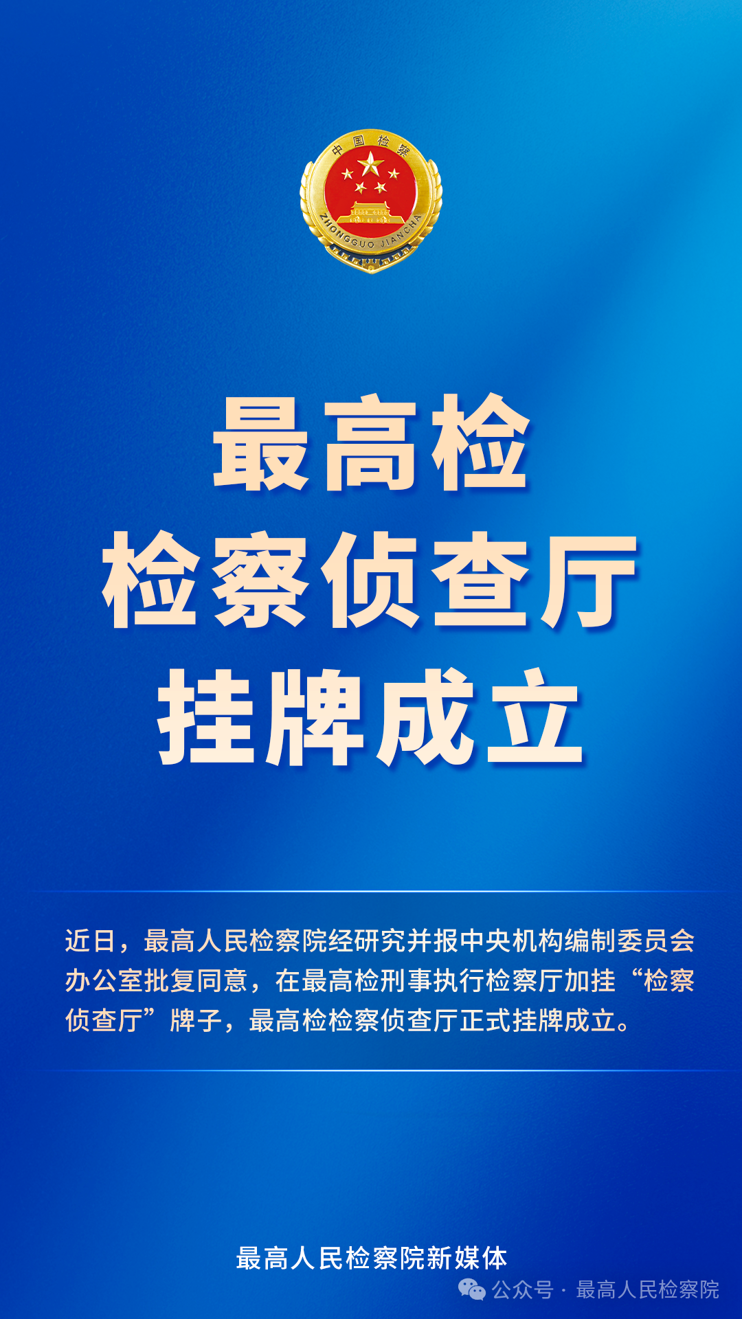 近日,最高人民检察院经研究并报中央机构编制委员会办公室批复同意,在最高检刑事执行检察厅加挂“检察侦查厅”牌子,最高检检察侦查厅正式挂牌成立。