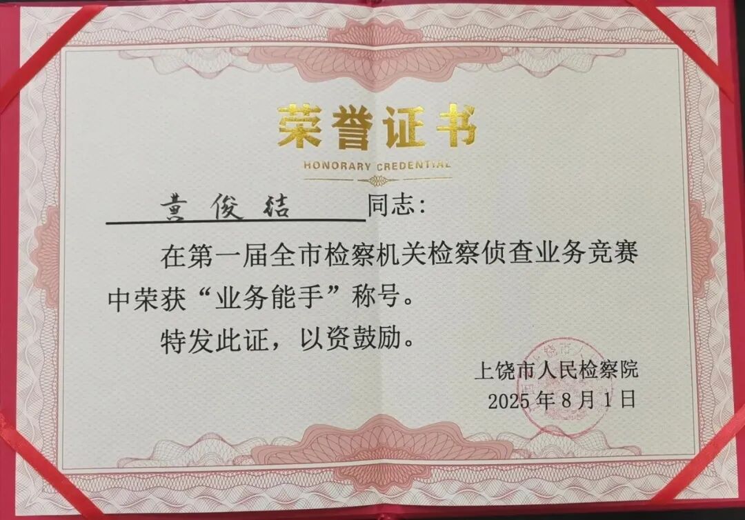 今日,在第一届市检察机关检察侦查业务竞赛中我院黄俊结同志荣获“业务能手”称号