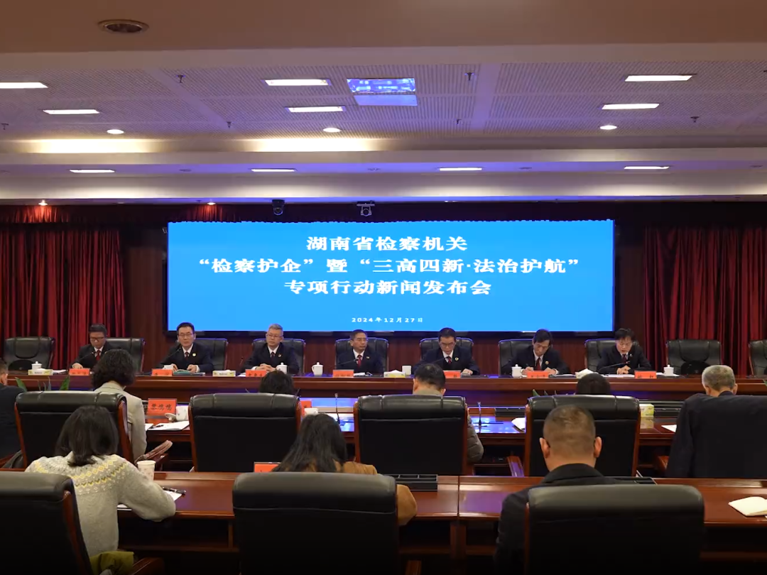 12月27日,湖南省检察院召开新闻发布会,通报全省检察机关“检察护企”暨“三高四新·法治护航”专项行动推进情况,并现场发布白皮书,回答记者提问。