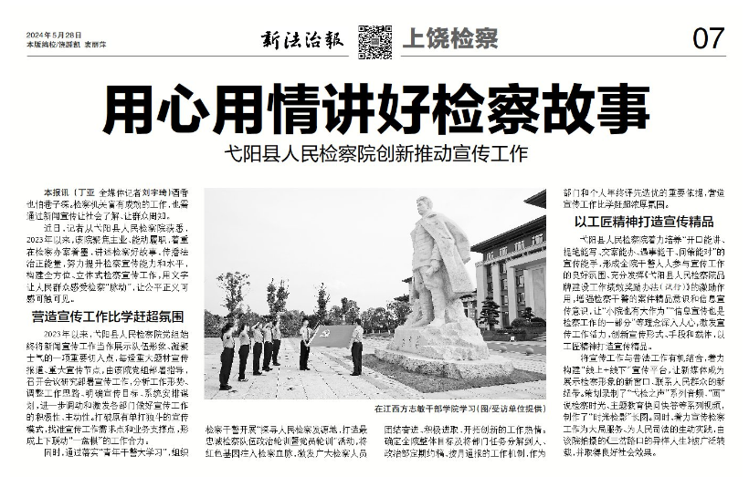 近年来,弋阳县人民检察院党组高度重视新媒体建设和新闻宣传工作,牢牢把握新时代检察宣传工作的基本规律,扎实开展新闻宣传工作,把宣传工作作为展示检察机关形象,提高检察机关影响力,不断加大宣传工作力度,凝聚检察正能量,为检察工作不断发展营造良好舆论氛围。2024年5月28日新法治报,大篇幅刊发了我院新闻宣传工作。