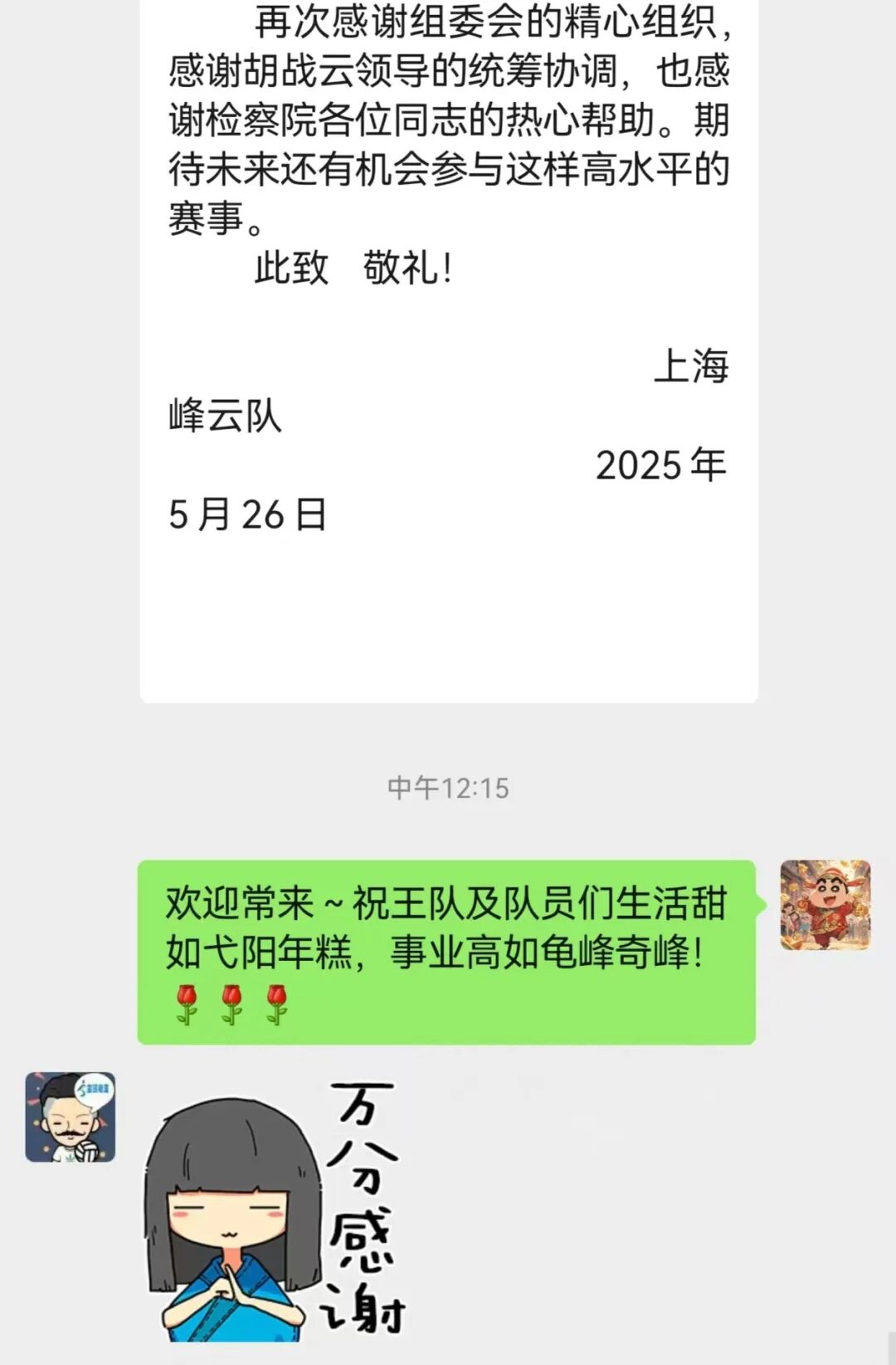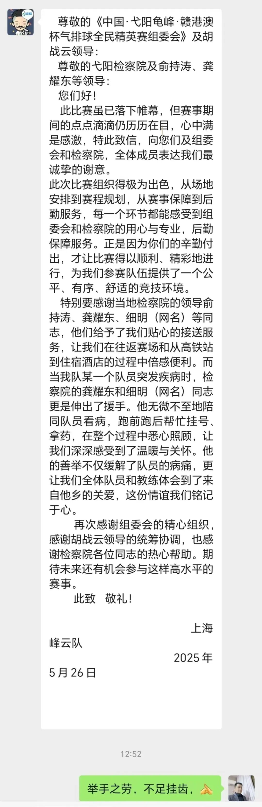 近日,弋阳县人民检察院收到了一封特别的来信——来自上海峰云队的感谢信。信中真挚的文字,记录着比赛期间政治部、办公室干警们对上海峰云队的贴心的接待服务,字里行间流淌着温情与感动。