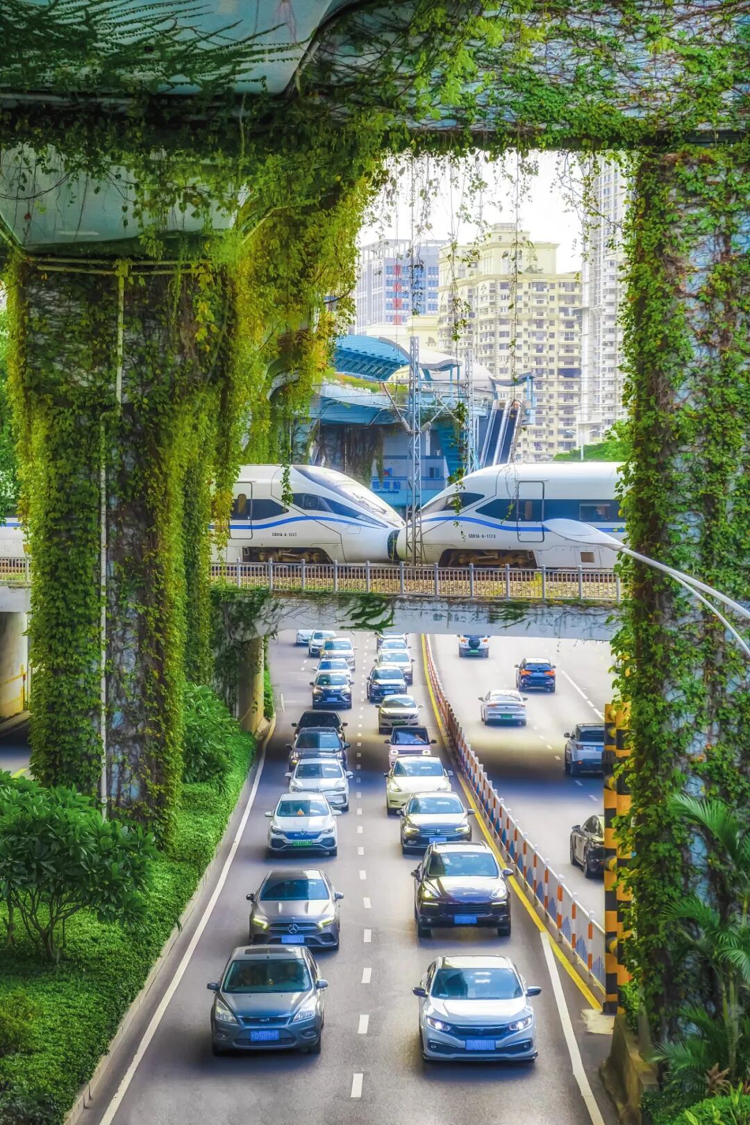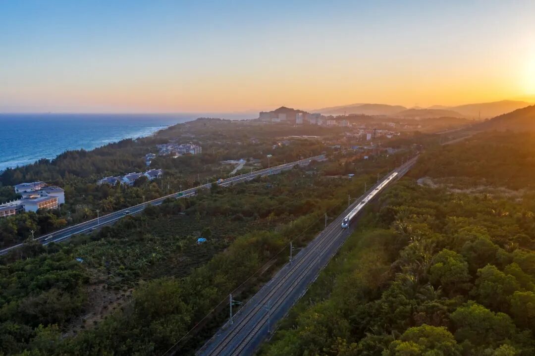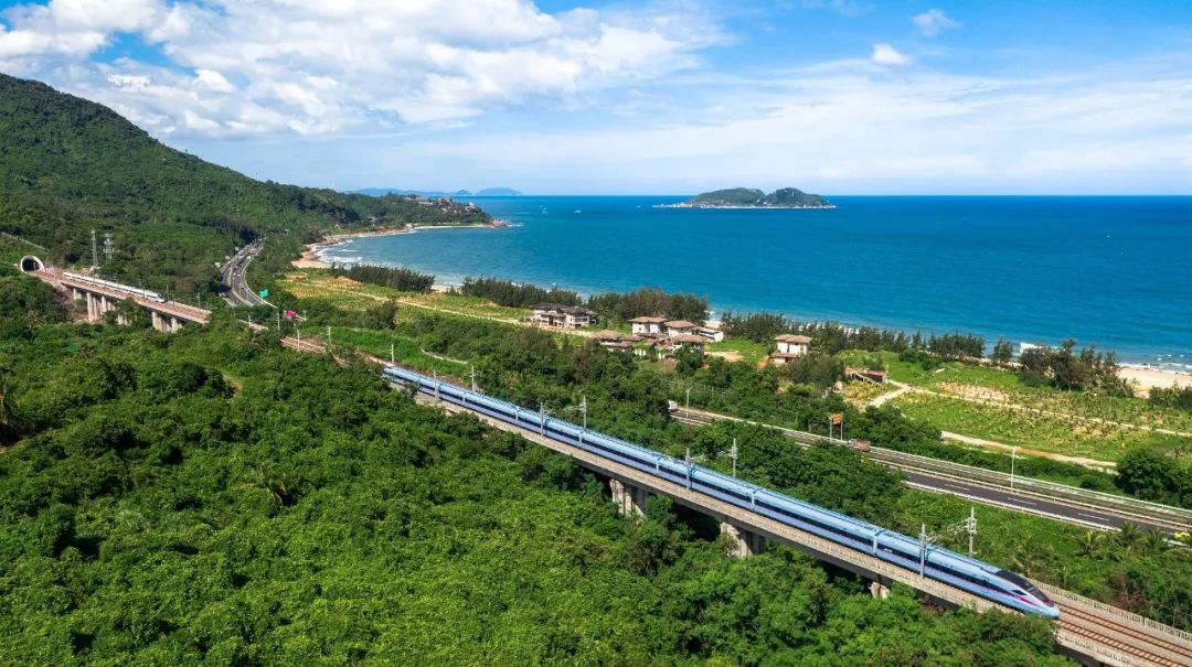 这条通道 含有世界首条热带滨海环岛高铁 ——海南环岛高铁 在飞奔的列车上 透过车窗遥望蔚蓝的大海 是那么心旷神怡