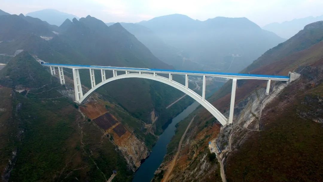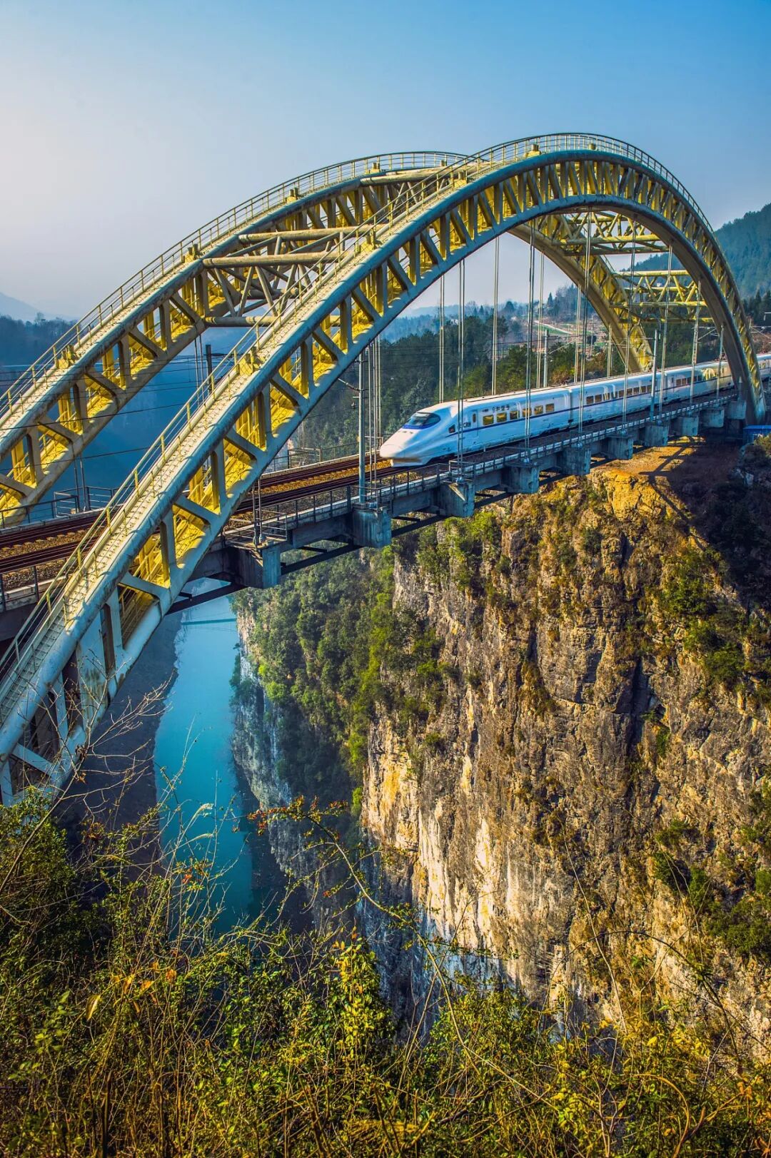 从上海枢纽出发 还有一条通往西南方向的沪昆通道 它沿途地质环境复杂 跨越众多峡谷 全长721米的贵州北盘江特大桥 桥面距江面约300米