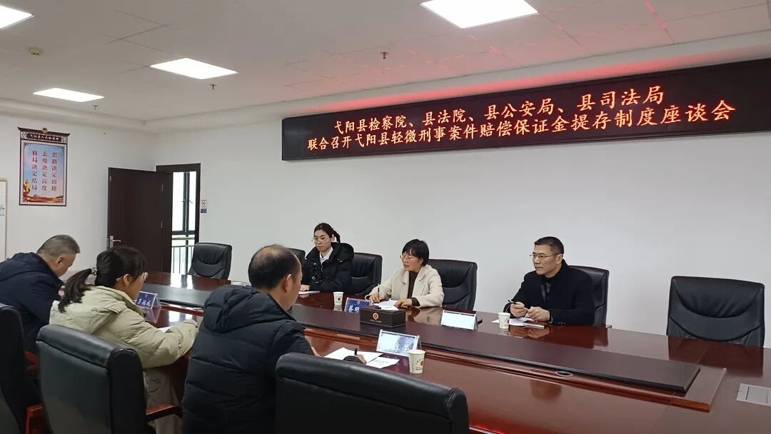 为推动基层轻罪治理,贯彻落实宽严相济刑事政策,积极化解社会矛盾、保障当事人合法权益。1月9日下午,弋阳县人民检察院组织县法院、县公安局、县司法局就推动建立轻微刑事案件赔偿保证金提存制度进行座谈交流。会议由县人民检察院党组书记、检察长蔡明筱主持,县法院、县公安局、县司法局分管相关工作的领导参加会议。